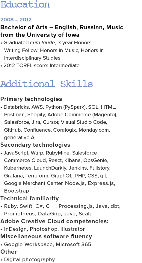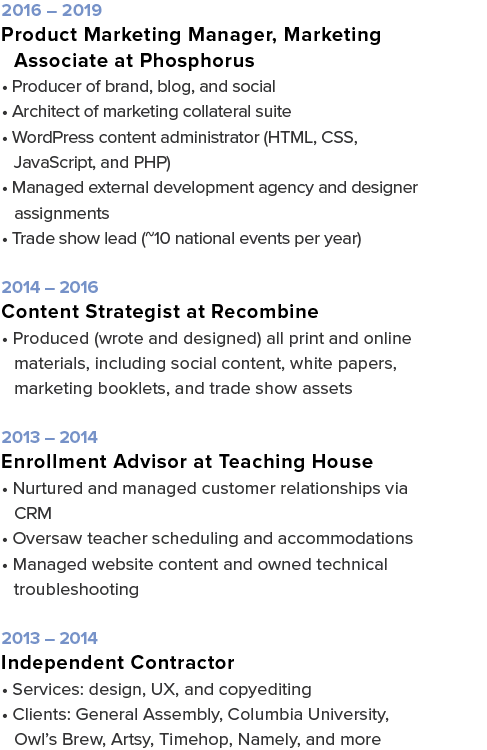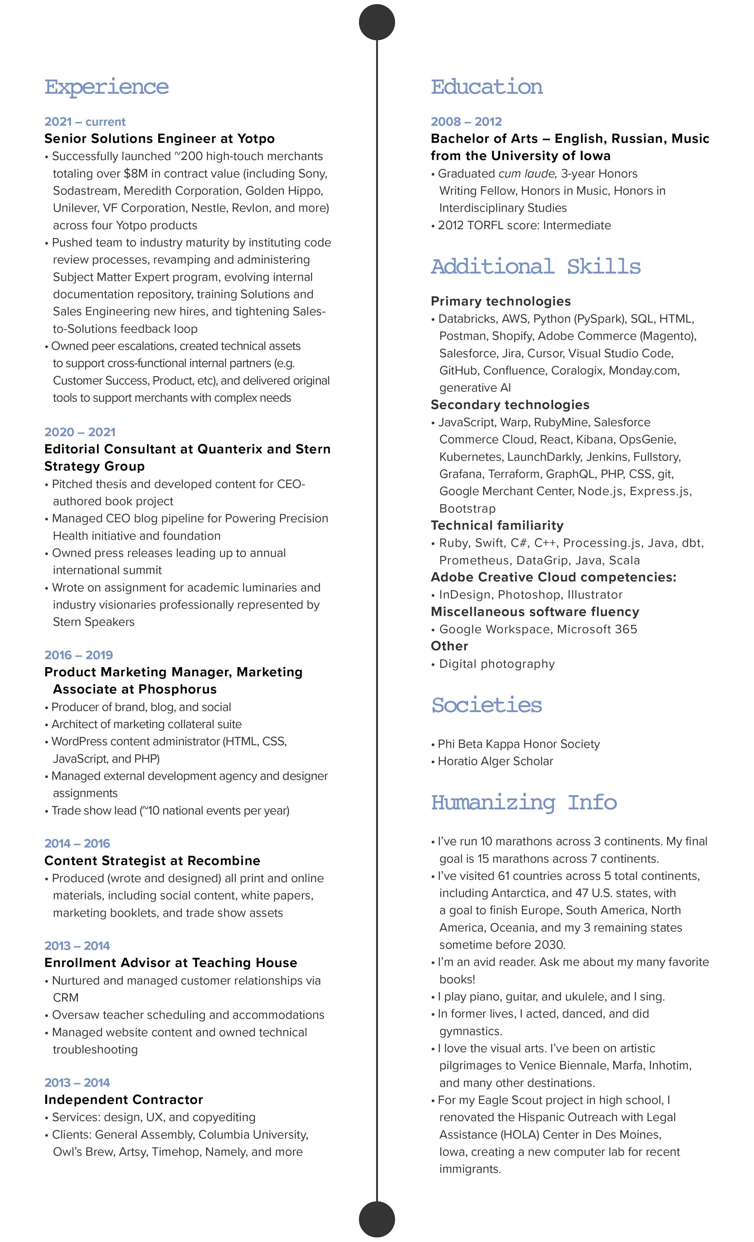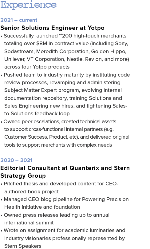 Hello! I’m a senior engineer with thirteen years of work experience in the NYC metro area. In my current Solutions capacity, I’ve launched hundreds of my company’s most strategic and high-value Western Hemisphere merchants, whose cumulative contract value exceeds $8M. I instituted my team’s first-ever code review process, launched an improved Subject Matter Expert program, and managed peer escalations, all while building out technical resources across four company product lines. In non-engineering roles, I’ve led marketing efforts at genomics start-up Phosphorus, drafted CEO book content for NASDAQ-traded healthcare company Quanterix, and written for Ivy League professors and Silicon Valley technologists through Stern Strategy Group.